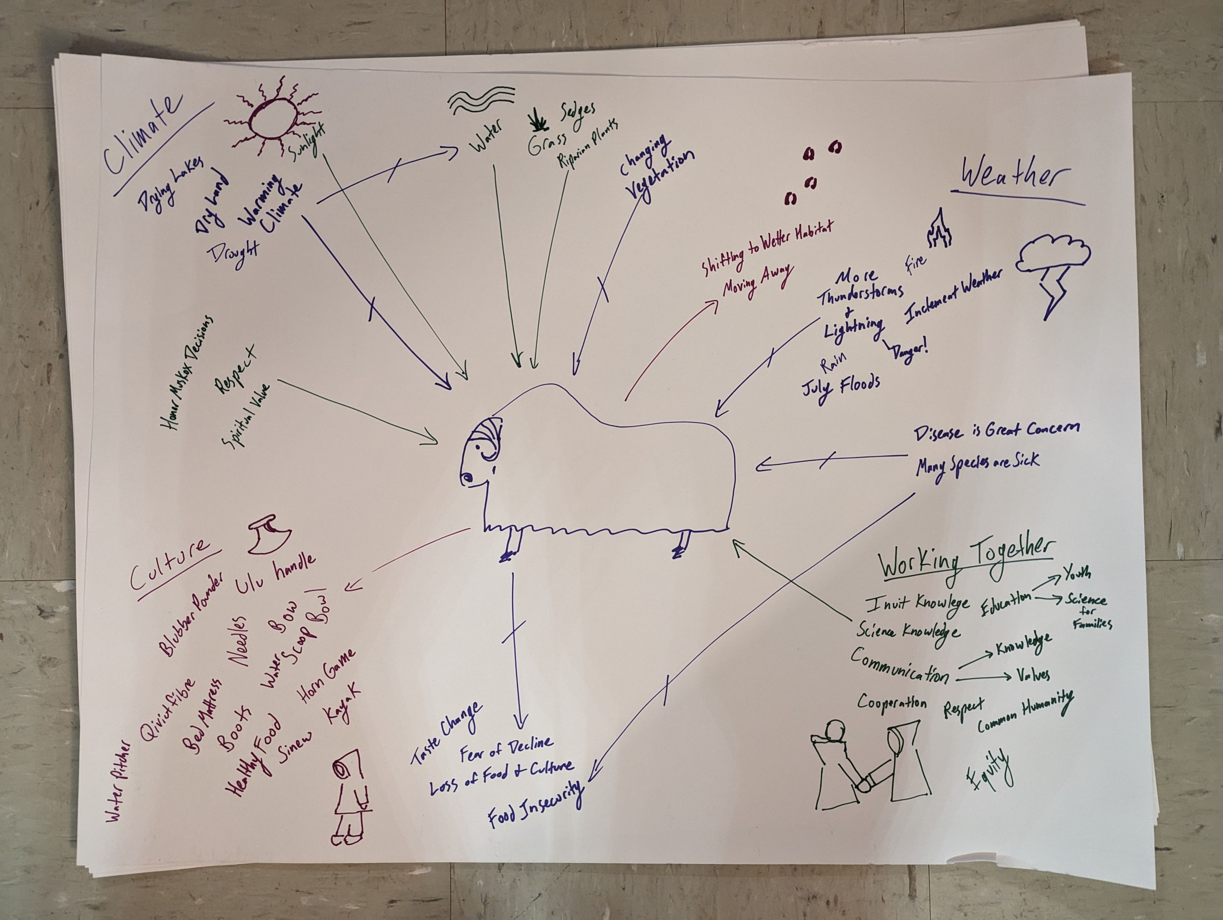 Pictured Here: An image of a symbolic representation of Inuit social and natural ecology as it centers around Muskoxen, a keystone cultural species for the community of Cambridge Bay. This image was co-created during a workshop in Cambridge Bay, NU at the Canadian High Arctic Research Centre (CHARS) wherein KHS Elders-In-Residence (Mabel Etegik, Emily Angulalik, and Bessie Omilgoetok) described the aspects depicted as they were translated in real-time by Emily Angulalik and transcribed by McCaide Wooten and Srijak Bhatnagar. Such knowledge maps are transcribed into digital concept mapping tools; the concepts and relationships are then encoded into the knowledge model; the knowledge model is then represented in (and associated resources made available through) the knowledge graph database. Photo credit: Christy Caudill